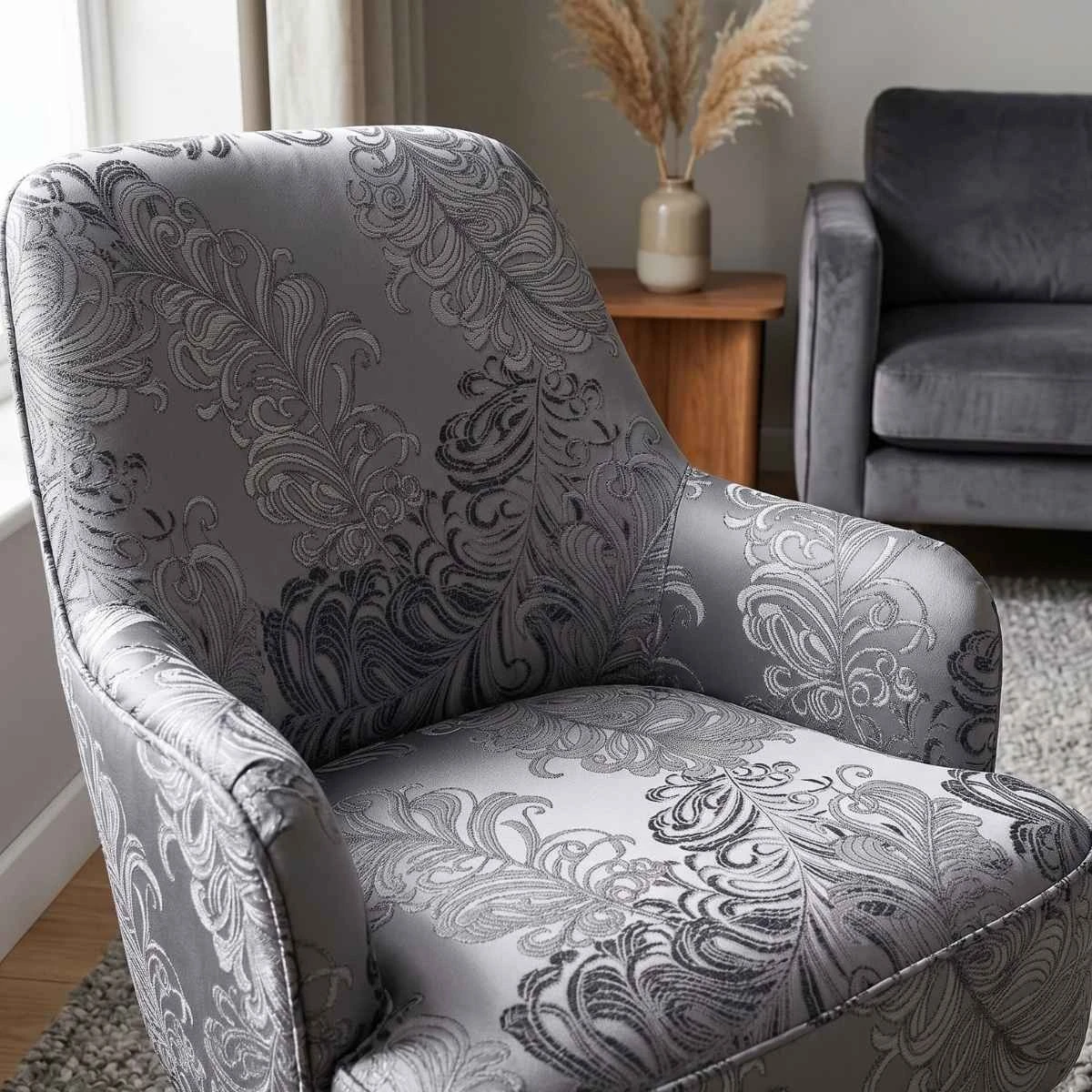 Tkanina tapicerska żakardowa Diva Grafit to elegancki materiał, który zachwyca nowoczesnym wzorem inspirowanym delikatnymi piórami, osadzonymi na głębokim, grafitowym tle. Wyrafinowany żakardowy splot nadaje tkaninie wyjątkowej tekstury i trójwymiarowego efektu, subtelnie odbijając światło, co dodaje jej luksusowego charakteru. Kolor grafitowy, w połączeniu z bogatym wzornictwem, sprawia, że Diva Grafit idealnie wpisuje się w aranżacje wnętrz o eleganckim i nowoczesnym stylu. Doskonale nadaje się do tapicerowania sof, foteli czy poduszek, wprowadzając do wnętrza ponadczasową elegancję i styl. Tkanina ta jest trwała, odporna na zużycie, co czyni ją praktycznym, a jednocześnie pięknym wyborem do każdego wnętrza.