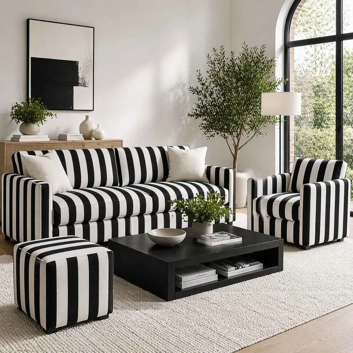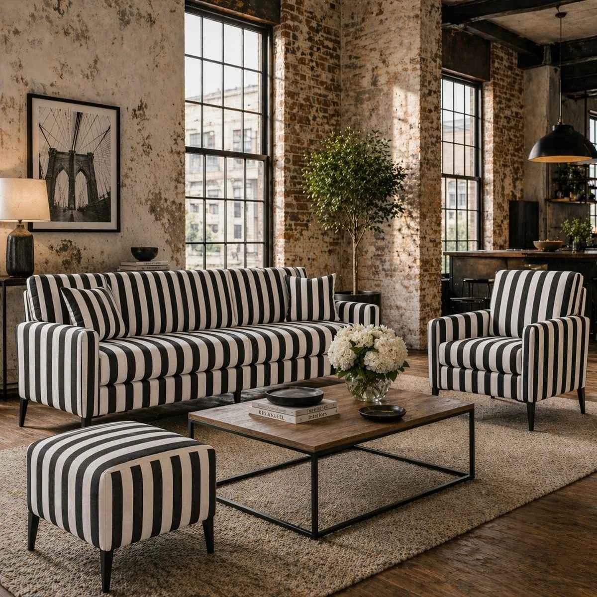 Wzór pasów to jeden z najbardziej uniwersalnych motywów w tapicerstwie. Tkanina w pasy może optycznie wpływać na odbiór mebla i całego wnętrza. W zależności od sposobu ułożenia materiału pasy mogą podkreślać linię siedziska, oparcia lub boków mebla, nadając całości bardziej dynamiczny albo uporządkowany wygląd. To dobry wybór dla osób, które szukają materiału dekoracyjnego o wyraźnym, ale nieprzesadzonym wzornictwie.